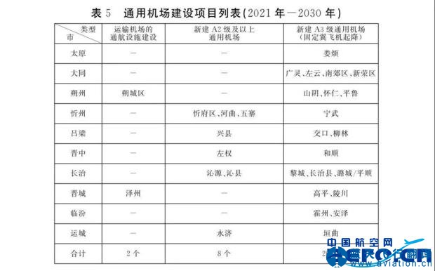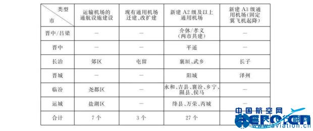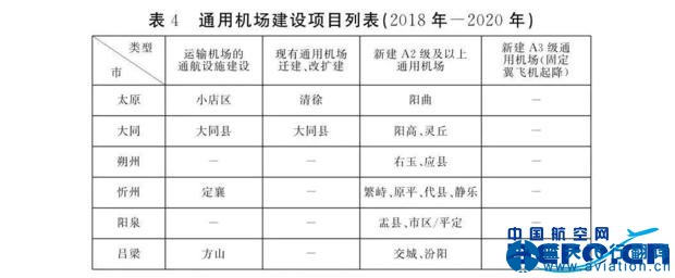 目前,山西省现有太原武宿国际机场、运城张孝机场、长治王村机场、大同云冈机场、吕梁大武机场、忻州五台山机场、临汾乔李机场等7个运输机场,均能提供通用航空服务保障;规划建设2个运输机场,即朔州机场和晋城机场。不过,需要注意的是,目前仅仅有太原尧城机场、大同东王庄机场、长治沙庄机场等3个通用机场在使用。此外,筹建中的通用机场有大同东王庄(迁建)、灵丘(军民合用)、阳高,忻州繁峙,运城绛县、芮城,晋城阳城,临汾侯马、乡宁等十余个机场。
