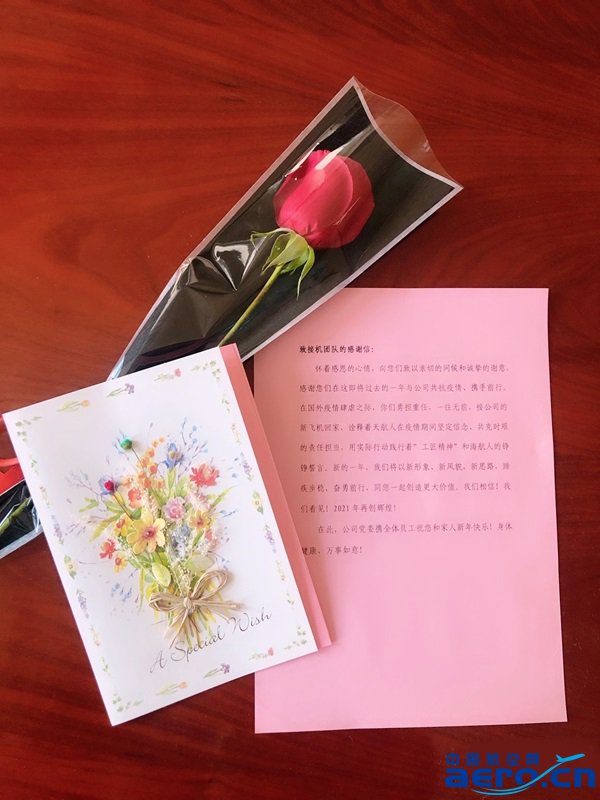 完成检测程序与交付中心工作人员合影 欢迎家人们回家 12月19日15:39分,连续两架A320Neo落地天津滨海国际机场,在防疫要求下,天津航空公司领导为接机组举行了简约而隆重的接机仪式,向接机机组送上慰问和关切,并在隔离酒店提前进行精心布置安排。因隔离阶段正值跨年,公司还为全体接机组精心准备了“跨年大福袋”,感谢他们在国外疫情依旧严峻之际,挺身而出,胸怀家国,倾情奉献。他们不辱使命、勇担重任,也正体现了“员工是企业最宝贵的财富”的真谛。