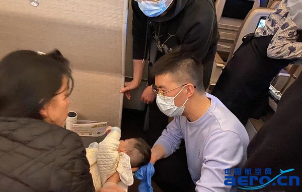 空中救治现场 了解情况后,乘务员立即报告客舱经理和机长,同时广播寻找到旅客中的4位医生,乘务员将机上的应急医疗箱和氧气瓶递到医生手中。13:58,医生检测到婴儿瞳孔正常,心率110。孩子持续呕吐,四位医生查看情况后,建议尽快落地,取得医疗救助。